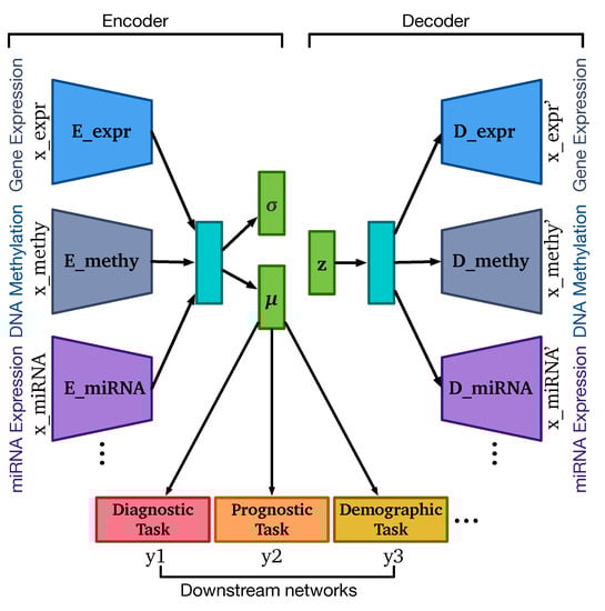 - Zhang, X.; Zhang, J.; Sun, K.; Yang, X.; Dai, C.; Guo, Y. Integrated Multi-omics Analysis Using Variational Autoencoders: Application to Pan-cancer Classification. In Proceedings of the 2019 IEEE International Conference on Bioinformatics and Biomedicine (BIBM), San Diego, CA, USA, 18–21 November 2019; pp. 765–769. [Google Scholar]