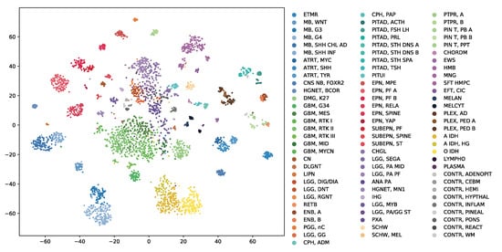 The 128D latent space of the BTM dataset learnt by the unsupervised phase of OmiEmbed. The scatter graph was visualised using t-SNE. Each label in the scatter graph was coloured by its methylation class label and the full name of each class abbreviation can be found in Supplementary Table S2. Tumour types belonging to the same upper-level class were marked in similar colours.