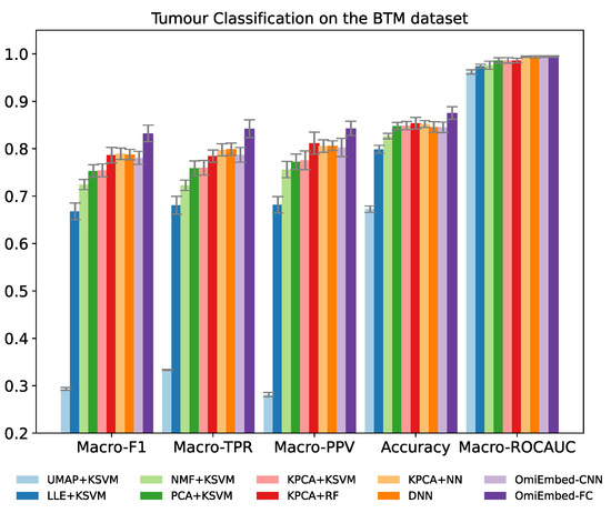 The result of OmiEmbed was first compared with the combination of five dimensionality reduction methods and kernel support vector machine (KSVM). The five different dimensionality reduction methods included uniform manifold approximation and projection (UMAP) [33], locally linear embedding (LLE) [34], non-negative matrix factorization (NMF), principal component analysis (PCA) and kernel principal component analysis (KPCA) [35]. The original data from the BTM dataset were first reduced to 128D by the aforementioned dimensionality reduction methods and then classified by the KSVM with a radial basis function (RBF) kernel. The best results among them were achieved by KPCA, therefore, other machine learning methods were evaluated along with KPCA, including random forest (RF) [36] and neural network (NN). The NN used here was comprised of two hidden layers with 128 neurons and 64 neurons, respectively. The deep neural network (DNN) with the structure of 1024-512-256-128 was also compared with OmiEmbed in an end-to-end manner. As illustrated in Table 2, Figure 3, Supplementary Table S4 and Supplementary Figure S3, OmiEmbed achieved the best classification performance in all the five metrics, with both types of classification systems.
