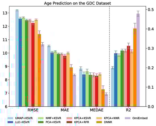 Since the label of age is numerical instead of categorical, the regression downstream module was applied for the age prediction task. The performance of age prediction was evaluated by the three regression metrics: median absolute error, mean absolute error, root mean square error (RMSE) and coefficient of determination (), which was illustrated in Table 6 and Figure 4. For median absolute error, mean absolute error and RMSE lower values represent better regression performance, whereas for score higher values indicate better regression performance.