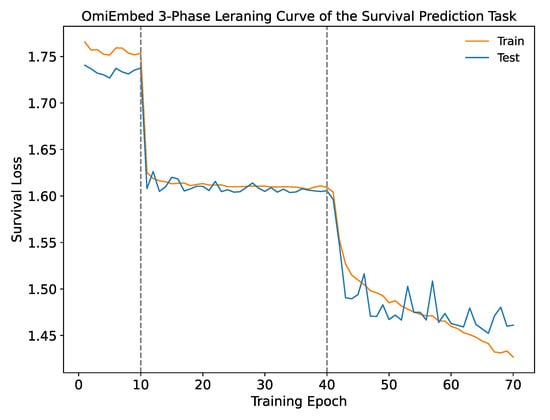 With the survival prediction downstream module of OmiEmbed, we are able to predict the survival function of each subject from corresponding high-dimensional omics data. Just like other downstream tasks, OmiEmbed was trained by the three-phase training strategy for the survival prediction task. Survival losses at each epoch on the training and testing set were illustrated in Figure 5 with a step shape learning curve. The first ten epochs were in Phase 1, where the embedding network was pretrained in an unsupervised manner. In epoch 11 to epoch 40, the downstream network was trained individually when the pre-trained embedding network was fixed, and in the last phase, the whole network was fine-tuned for better performance, which is consistent with the learning curve.