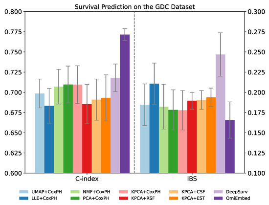 Performance comparison of OmiEmbed and other nine methods for the survival prediction task on the GDC dataset. For C-index, higher values mean better prediction performance. For IBS score, lower values mean better prediction performance.
