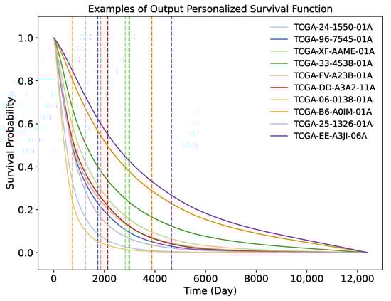 OmiEmbed is able to output the personalised survival function based on the corresponding omics profile. As illustrated in Figure 7, we randomly selected ten subjects with their observed death time from the testing set of the GDC dataset as examples and plotted the survival curve for each of them. The actual death time of each subject was also marked in the figure by the dashed vertical line with the corresponding colour.