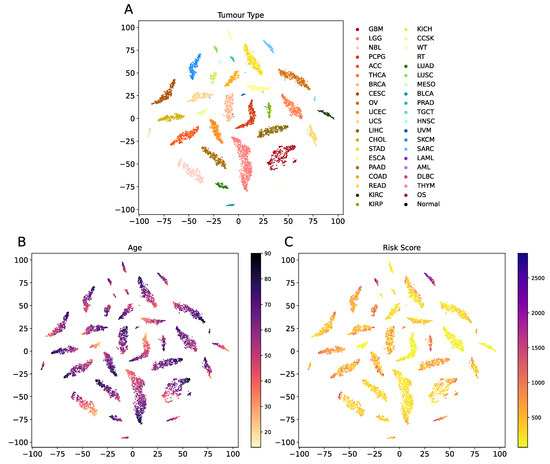 Visualisation of the latent space learnt by the multi-task OmiEmbed. Each sample was colour by its tumour type (A), age (B) and risk score (C) in three corresponding scatter graphs with the same latent representation. Apparent patterns related to the three types of labels can be seen in the scatter graphs.
