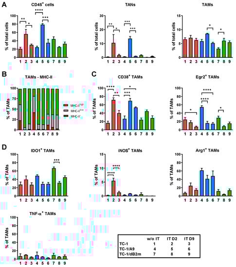 In the non-treated mice, the numbers of CD45+ cells were comparable for TC-1- and TC-1/A9-induced tumors, constituting about 20% of total live cells (Figure 2A). Two days after the completion of IT, the numbers of these cells significantly increased in both tumor types, and after another week, they dropped down to a level comparable with that of the naïve tumors. Combined IT did not induce significant alterations in the proportion of CD45+ cells in TC-1/dB2m-induced tumors throughout the experimental period. Infiltration kinetics of tumors with tumor-associated neutrophils (TANs; CD11b+Ly6GhighLy6Clow) reflected that observed for CD45+ infiltration. While combined IT increased the TAN infiltration of TC-1- and TC-1/A9-induced tumors, it did not promote TAN migration to the TC-1/dB2m tumors. In contrast to the variable numbers of CD45+ cells and TANs, the number of TAMs (CD11b+Ly6G−Ly6C−F4/80+) remained unchanged in TC-1-tumors, while the number of TAMs infiltrating TC-1/A9- and TC-1/dB2m-induced tumors was slightly increased after combined IT (Figure 2A). As in our former reports [15,29], we analyzed a TAM polarization state through the expression of MHC-II molecules, which is regarded as an M1 macrophage marker (Figure 2B). We observed the increase in the surface expression of MHC-II molecules only in the treated TC-1- and TC-1/A9-induced tumors, while the majority of TAMs from TC-1/dB2m-induced tumors expressed high levels of MHC-II regardless of the treatment. To better distinguish TAM phenotypes, we applied another classification system in which CD38 and Early growth response protein 2 (Egr2) are used to define M1 and M2 murine macrophages, respectively [43]. As demonstrated in Figure 2C, Egr2+ TAMs decreased in all tumor types after combined IT. Simultaneously, the proportion of CD38+ TAMs increased, but this increase was only significant in treated TC-1 and TC-1/A9 tumors in this experiment.