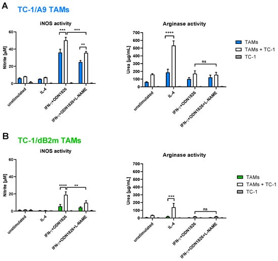 In Vitro modulation of arginine-metabolizing enzymes in co-cultures of TAMs with tumor cells. TAMs, TC-1 cells, and co-cultures of TAMs from TC-1/A9 (A) or TC-1/dB2m tumors (B) with TC-1 cells were stimulated with IL-4 or IFN-γ plus ODN1826 for 44 h. The activity of iNOS in M1 TAMs was blocked with L-NAME. Subsequently, supernatants from co-cultures were collected, and nitrite concentration and arginase enzymatic activity were measured with Griess reagent (A,B; left-hand graphs) and by microplate method on cell lysates (A,B; right-hand graphs), respectively. The unstimulated cells were used as a negative control. Columns indicate mean of three independent experiments; bars: ± SEM; ns; non-significant, ** p < 0.01, *** p < 0.001, **** p < 0.0001.