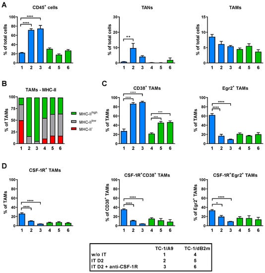 We observed that the enhancement of combined IT with anti-CSF-1R did not cause any significant changes in tumor infiltration with immune cells (CD45+) in both TC-1/A9 and TC-1/dB2m tumors. The proportion of the TAN population in the treated TC-1/A9 tumors slightly decreased with the addition of anti-CSF-1R, but the number of TAMs was not significantly affected by this monoclonal antibody (Figure 7A).