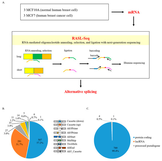 Pre-mRNAs undergo altered AS in human breast cancer cells. (A) Schematic representation of the RASL-seq technique using RNA extracted from human breast cancer cells (MCF7) and normal breast cells (MCF10A). (B) Pie chart showing different AS events from RASL-seq results. All events listed are drawn in the right. (C) Gene distribution of our RASL-seq results.