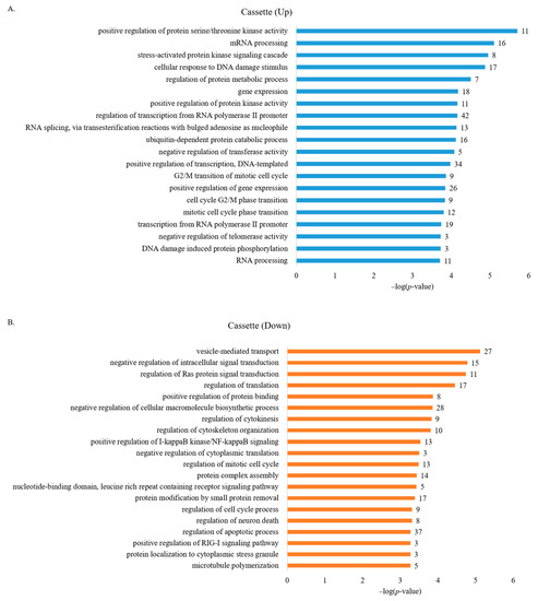 GO analysis of genes with aberrant AS regulation in human breast cancer cells identified several biological processes related to cancer progression. (A) GO analysis of genes enriched in up-regulated AS cassette exons. (B) GO analysis of genes enriched in down-regulated AS cassette exons.