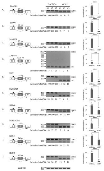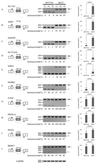 Validation of AS up-regulated cassette exons in human breast cancer cells. (A–J) (Left) For each gene, the schematic representation of the genomic region containing the AS cassette exon is shown. Exon numbers are shown in the gray boxes. The length of AS cassette exons is shown. Inclusions of cassette exons are shown with dotted grey lines. Skipping events are shown with dotted black lines. Arrows indicate primers used in RT-PCR. (Middle) RT-PCR analysis (in triplicated) of the AS profile of cassette exons was performed by using RNA extracted from human breast cells. Quantitation results are shown at the bottom of each gel. (Right) Statistical analysis graphs of RT-PCR. Error bars = standard deviation (SD) calculated from three independent experiments. **** p < 0.0001, *** p < 0.001. Uncropped figures are shown in Supplementary Figure S7.