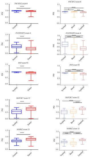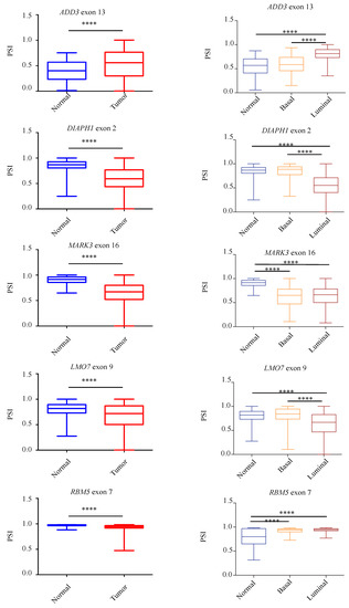 To further assess the presence of the identified aberrant AS events in tumors compared to normal breast tissues, we take advantage of the Cancer Genome Atlas (TCGA-BRCA) [34] to compare a large number of non-pathological samples with primary breast tumors. In particular, we analyzed the splicing pattern of 10 RASL-seq identified and validated events by using the TCGA SpliceSeq web-tool (http://projects.insilico.us.com/TCGASpliceSeq; accessed on 14 May 2021) [33]. As shown in Figure 5, we confirmed an aberrant increase of cassette exon skipping in tumor specimens for PACSIN2 exon 8, DIAPH1 exon 2, FGFR1OP2 exon 4, MARK3 exon 16, DST exon 93, LMO7 exon 10, and RBM5 exon 7, whereas ADD3 exon 13, MAP3K7 exon 12, and MARK2 exon 15 were preferentially included in tumor specimens. Noteworthily, for the majority of the events, luminal tumors (A and B subtypes) showed a higher difference in the PSI with respect to basal ones when compared to normal tissues (Figure 5). Importantly, we were also able to confirm, by RT-PCR, the aberrant AS regulation of PACSIN2, DIAPH1, MARK3, ADD3, MAP3K7, and MARK2 in RNA extracts from two human tumor breast cancer samples tissues and two non-pathological tissues (Figure S4).