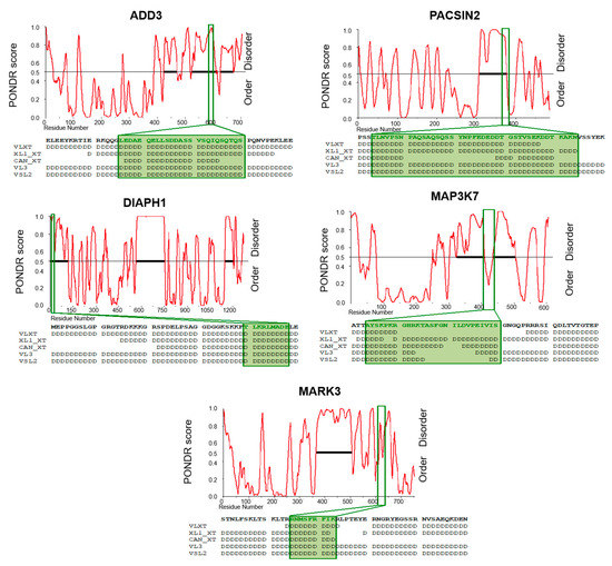 Interestingly, dysregulated AS cassette exons do not encode for any predicted functional domain. Nevertheless, we found that these regulated exons encode for amino acids overlapping with intrinsically disordered regions (IDRs) (Table S6). IDRs are highly flexible regions, frequently enriched with charged/polar amino acids and depleted of hydrophobic residues that connect structured protein domains [42]. Importantly, these sequences do not mediate co-operative folding and lack a unique three-dimensional structure, thus providing an extreme flexibility that could favor conformational heterogeneity and post-translational modifications [43]. To further confirm the presence of IDR in the protein regions encoded by breast-cancer-associated AS events, we analyzed ADD3, PACSIN2, DIAPH1, MARK3, and MAP3K7 protein sequences with the PONDR web tool, a predictor of natural disordered regions [36,37]. As shown in Figure 6, the amino acids encoded by these exons are located in IDR predicted by different PONDR algorithms (Figure 6).