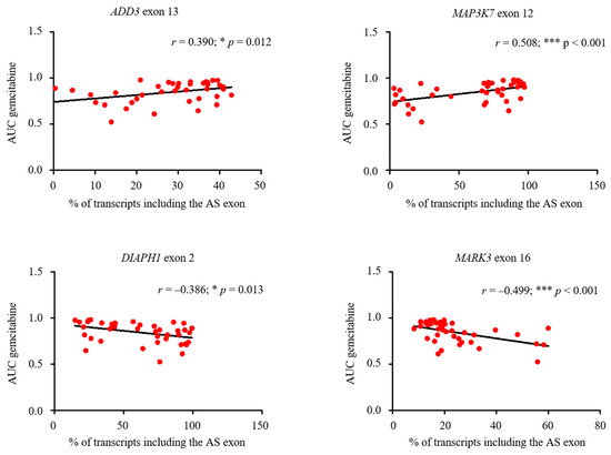 Correlation of IDR-encoding AS events and gemcitabine sensitivity in breast cancer cells. ADD3 exon 13, MAP3K7 exon 12, DIAPH1 exon 2, and MARK3 exon 16 containing isoforms (% of transcripts) and gemcitabine sensitivity (AUC, area under the dose–response curve) correlation in 41 breast cancer cell lines. Pearson coefficient (r) and linear regression are also shown. *** p < 0.001; * p < 0.05.