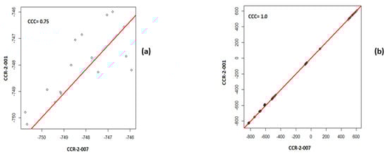 Pairwise plot of the first order mean values with the CCC for (a) a single layer of the phantom (ABS-040), (b) all layers of the phantom, for the scans CCR-2-001 and CCR-2-007.