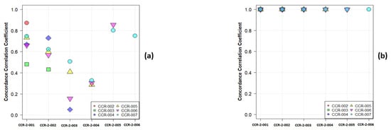 Consider a simple example—namely that of the first order mean. The phantom in question has 10 layers representing different tissues, including several layers that have a uniform single material. In Figure 1, we show a plot of the paired values of the mean for a single layer and for the whole phantom. By default, all CT scanners use, at a minimum, a two-point calibration of the Hounsfield units (HU), typically performed daily. Nevertheless, CT scans are subject to both stochastic noise arising from the X-radiation and electronic noise in the CT scan, and non-stochastic sources of error in the CT systems, such as reconstruction artefacts. However, due to the calibration, the average HU values of a given material in the phantom will be nearly identical in any two scans, regardless of pixel size, especially when averaged over large regions. Figure 1a shows the results for a single layer: they are not strongly correlated, nor should they be correlated if the layer represents a single material or a simple admixture of materials. By contrast, in Figure 1b, we show the results for analysing all phantom layers. As expected, the results are highly correlated since the phantom spans a range of materials. In Figure 2a,b, we show the Concordance Correlation Coefficient (CCC) [] value for the grayscale mean pairwise across the seven scans, CCR-2-001 to CCR-2-007, considered in our paper. Note that, in analysing a single layer (Figure 2a), we see a moderate to no correlation. This arises directly from the physics of imaging objects with limited material differences; the average HU should only vary by stochastic noise and non-stochastic errors. When we analyse all layers (Figure 2b), all scans show high correlation with each other, as expected. Of note, Orhlac and Buvat used ROIs that were smaller in volume than ours, which only serves to increase the stochastic noise, and leads to even more false correlations.