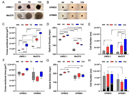 Generation of 3D tumor spheroids from UM and UPM cell lines. UM or UPM cells were seeded at 5000 cells per well. (A) Spheroids generated from UM cell lines UM92.1 and Mel270. Representative images are shown at day 4, 7 and 12 (4× magnification; scale bar of (A) represents 1000 µm). (B) Spheroids generated from UPM cell lines UPMD2 and UPMM3. Representative images are shown at day 4, 7 and 12 (4 × magnification; scale bar of (B) represents 1000 µm). (C,F) Spheroid cross-sectional area (µm2) and (D,G) optical density (mgv, mean grey value) were determined (n = 5 each time point). (E) UM spheroids or (H) UPM spheroids were trypsinized, stained with trypan blue and live/dead cell numbers were counted at day 4, 7 and 12. Dead cells are indicated by black columns; % of dead cells is given. A statistical analysis was performed using a two-way ANOVA and Tukey’s multiple comparisons test; significance levels are indicated * p < 0.05, ** p < 0.01, **** p < 0.001.