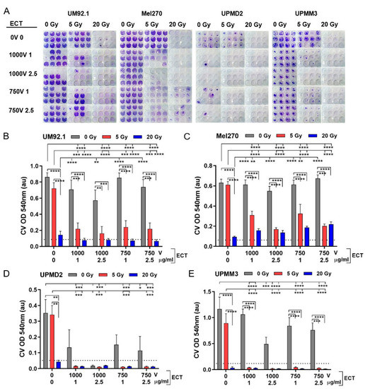 In order to determine the tumor control potential of the treatments, we analyzed the cytotoxic long-term effects of the treatments in a spheroid cell survival assay after another eight weeks in the cell culture (61 days after treatment). Basically, UM or UPM spheroids displayed a different ability of cell out-growth and proliferation in a long-time culture. The untreated UM spheroid cells formed a confluent and homogeneous cell monolayer (UM92.1, Mel270: 100% cell density) while UPM spheroid cells remained as a subconfluent and inhomogeneous monolayer (UPMD2: 60–70%; UPMM3: 80–90% cell density). The respective cell density was reflected by Crystal Violet (CV) staining of the cell nuclei/DNA (Figure 5A; representative images of the cell cultures received from untreated spheroids (0 Gy, 0 V)).