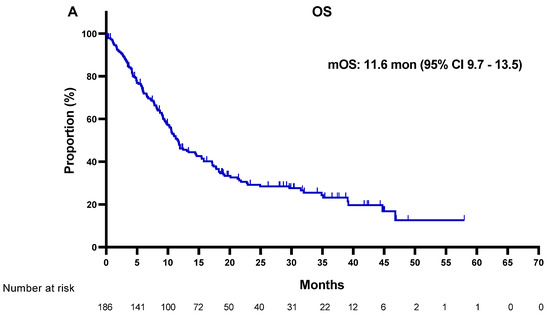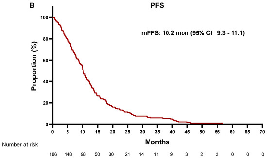 Kaplan–Meier plot for the entire study population. (A) Overall survival calculated from the date of MET ISH to the last follow-up date. (B) Progression-free survival of most recent tyrosine kinase inhibitor used. mOS, median overall survival; mPFS, median progression-free survival; CI, confidence interval; mon, month.
