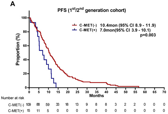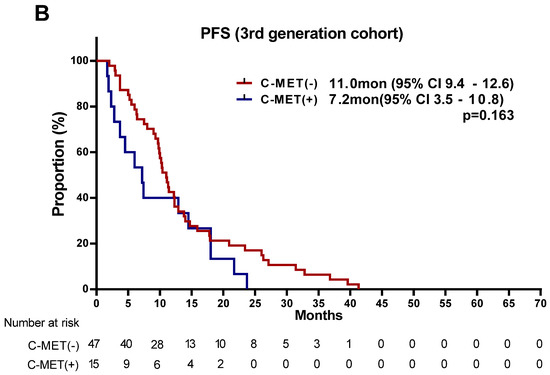 The median PFS for the latest TKI in the total population was 10.2 months (95% CI: 9.3–11.1) (Figure 1B). Because of differences in PFS between first-/second- and third-generation TKIs, we analyzed these drugs separately. For patients receiving first-/second-generation TKIs, PFS was significantly shorter in the MET-positive group than in the negative group (7.0 versus 10.4 months; p = 0.003). However, in the third-generation TKI group, there were no significant differences in PFS (7.2 versus 11.0 months; p = 0.163), and only similar trends were observed (Figure 2).