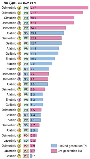 Treatment response with the most recent tyrosine kinase inhibitor. Response indicates the best response to the treatment. The number in the bar indicates progression-free survival in months. TKI, tyrosine kinase inhibitor; BoR, best of response; PFS, progression-free survival; PR, partial response; SD, stable disease; PD, progressive disease.