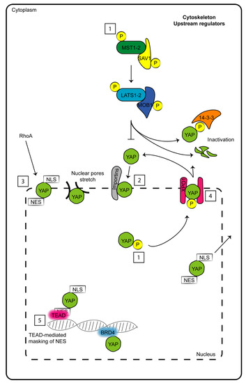 Schematic representation of factors which determine to date nuclear–cytoplasm shuttling of YAP. (1) Phosphorylations and dephosphorylations of both upstream Hippo members and YAP. (2) Nuclear import mediated by importins. (3) Nuclear import through nuclear localization sequence (NLS) and mediated by RhoA. (4) Nuclear export mediated by phosphorylations, nuclear exporting sequence (NES) and exportin 1 (XPO1). (5) Nuclear restraint caused by masking NES motif by TEAD or other partner interactions.