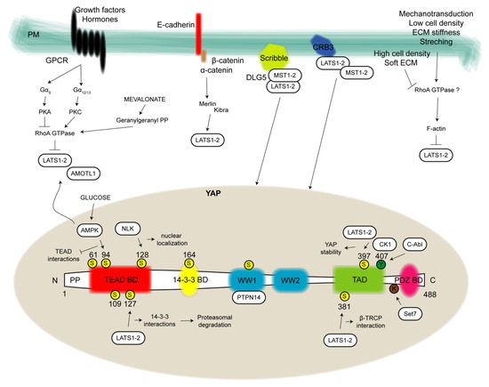 Overall, we can mention at least four large groups of upstream pathways that regulate YAP nuclear localization and function [33], subdivided into: (i) mechanotransduction; (ii) polarity and tight junction proteins; (iii) the cadherin-catenin complex; and (iv) soluble growth factors.