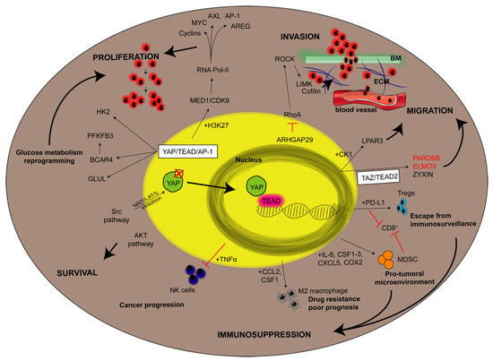 YAP downstream targets in cancer cells. The figure aims to give an overview about the downstream targets of YAP involved in a given step of cancer development taking into consideration studies led in vitro, in vivo and referring also to some correlations with poor prognosis in human patients. Steps of cancer development (indicated in bold uppercase) are proliferation, survival, invasion, migration and immunosuppression. They are linked to a given pathway by black bold arrows. Thin black arrows indicate either YAP-dependent protein overexpression (if the protein is reported in black) or protein downregulation (if reported in red). If the molecular pathway involves the contribution of additional YAP-dependent proteins expression, they are reported close to the arrows and preceded by “+”. Otherwise, red lines mean a block or an inhibition of a given pathway. AP-1: activator protein-1; AREG: amphiregulin; ARHGAP29: Rho GTPase activating protein 29; AXL: AXL receptor tyrosine kinase; BCAR4: breast cancer antiestrogen resistance 4; BM: basement membrane; CCL2: C-C motif chemokine ligand 2; CDK9: cyclin-dependent kinase 9; COX2: cyclooxygenase-2; CSF: colony stimulating factor; CXCL5: C-X-C motif chemokine ligand 5; ECM: extracellular matrix; ELMO3: engulfment and cell motility 3; GLUL: glutamate-ammonia ligase; H3K29: monomethylation oh histone 3; HK2: hexokinase 2; IL-6: interleukin 6; LIMK: LIM domain kinase 1; LY3009120: pan-RAF inhibitor; MED1: mediator complex subunit 1; MDSC: Myeloid-derived suppressor cells; NK: natural killer; LPAR3: LPA receptor 3; PARD6b: Par-6 Family cell polarity regulator beta; PD-L1: programmed death-ligand 1; PFKFB3: phosphofructokinase; ROCK: Rho-associated coiled-coil containing protein kinase 1; Tregs: regulatory T cells; 5FU: 5 fluorouracil.
