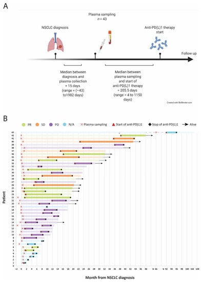 In total, 43 plasma samples were obtained from a cohort of 43 advanced NSCLC patients treated with anti-PD-(L)1 therapy. Samples were obtained at a median of 15 days after NSCLC diagnosis and a median of 205.5 days before the start of anti-PD-(L)1 therapy (Figure 1A,B). The patients’ clinical characteristics are summarized in Table 1. Of all treated patients, 18 (41.9%) had PD, 6 (14.0%) had SD, and 11 (25.6%) had PR. It was not possible to assess the clinical response in eight patients (18.6%) due to either interruption of therapy or loss of follow-up. The median PFS and OS were 4.7 months and 10.7 months, respectively.