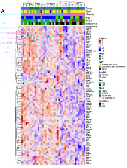 In our proteomic approach, the detected plasma protein levels might also be influenced by protein release from cancer tissue. This leakage can be utilized for detecting tumor-specific proteins, best exemplified by tumor markers, such as PSA or CEA, for screening purposes or monitoring treatment response [30,31]. On the other hand, particularly when immune markers and cytokines are quantified, plasma protein levels can be a result of the immune response in tumor tissue and in distant lymphoid organs. Therefore, protein profiles most likely reflect a combination of local and systemic cancer immunity. With this background, identifying regulated proteins might provide insight into how the immune system responds to cancer locally and systemically and why immune activation with checkpoint inhibitors is effective in some patients and not others.