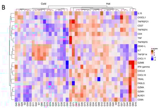 The focused analysis confirmed the observation of the existence of “hot” and “cold” archetypes. This was particularly pronounced for the T-cell activation markers (Figure 2B, Table 2 and Table S3).