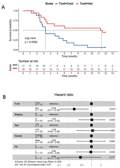 The association between progression-free survival (PFS) and the pretreatment plasma protein signature. (A) Kaplan–Meier PFS curves based on hot and cold T-cell activation signatures. A log rank test was performed to compare the two groups. (B) Multivariate Cox regression analysis of PFS in the key subgroups. The hazard ratio, 95% confidence interval, and p-value for each analysis are displayed in the plot. (* p ≤ 0.05, PS—performance status).
