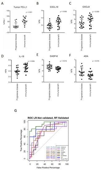 Tumor PD-L1 expression and plasma protein levels at the baseline and the development of the discriminatory model. The population (n = 43) was stratified into two groups: immune benefit (including stable disease and partial response) and progressive disease (including patients with progressive disease). (A) Comparison of tumor PD-L1 expression, assessed by immunohistochemistry, before the initiation of anti-PD-(L)1 therapy between the immune benefit and progressive disease groups. (B–F) Plasma proteins with differential expression before the initiation of anti-PD-(L)1 therapy. A two-tailed unpaired t-test or two-tailed non-parametric Mann-Whitney test was used. Only proteins with a p-value < 0.05 are displayed. Data are plotted as %PD-L1 or normalized protein expression (NPX). (G) Receiver operating characteristic (ROC) curves illustrating the discriminatory model for CXCL10, CXCL9, IL-15, CASP8, and ADA individually or combined and tumor PD-L1. A random forest model containing all 84 proteins was also evaluated.