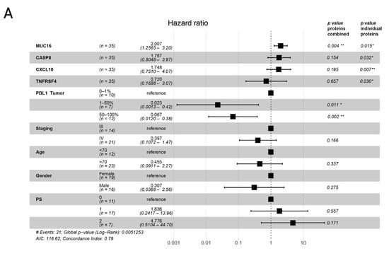 Similarly, when examining individual plasma protein levels with age, stage, gender, and PS as covariates in Cox regression analysis, we observed an association between plasma MUC16, CASP8, CXCL10, and TNFRSF14 levels and PFS. However, when these significant markers were combined with PD-L1 IHC expression in a single multivariate analysis with the same covariates, the only tumor-related protein found to have a significant association with the risk of progression in patients was MUC16; it was found at levels significantly above the median (HR = 2.01, CI = 1.26–3.20, p = 0.004; Figure 5A). In this multivariate analysis, PD-L1 expression in tumors (1–50% and 50–100%) was significantly associated with a lower risk of tumor progression over 12 months; this was not observed for patients with tumors that scored in the range of 0–1% (Figure 5A).