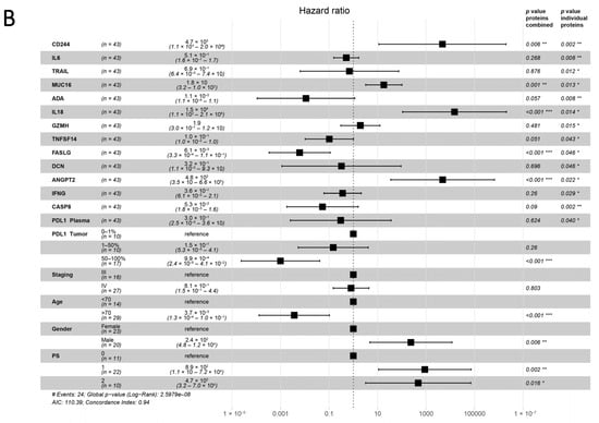 Hazard ratio forest plots. Data are based on multivariate Cox regression analysis for (A) progression-free survival (PFS) and (B) overall survival (OS). p-values are displayed for the multivariate analysis when each protein was analyzed individually and when all the proteins were combined. (* p ≤ 0.05, ** p ≤ 0.01, *** p ≤ 0.001, PS—performance status).