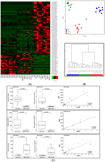 Total RNAs were shipped to the BGI company (Shenzhen, China) for small RNA sequencing. The NEBNext® Small RNA Library Prep Set for Illumina® (New England Biolabs Ipswich, MA, USA) was used for library preparation and small RNA sequencing experiments were performed using the HiSeq 4000 platform (Illumina, San Diego, CA, USA) and the SE50 (single-end 50 bp) sequencing protocol. Quality control was performed using FastQC software (Andrews S. (2010). FastQC: a quality control tool for high throughput sequence data. Available online at: http://www.bioinformatics.babraham.ac.uk/projects/fastqc, accessed on 14 May 2021) showing very high quality of the reads (Phred quality score above Q30). The obtained reads have been mapped to reference genome (GRCh37) using Bowtie (http://bowtie-bio.sourceforge.net/index.shtml, accessed on 31 March 2016) software, and the miRNA quality has been estimated with the CAP-miRSeq (http://bioinformatics.mayo.edu/research/cap-mirseq/, accessed on 31 March 2016) package. Further processing of the data including filtration, normalization and statistical calculations was performed using the edgeR package (Bioconductor) (PMID: 19910308).