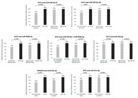 Interaction between selected miRNAs and their target genes (ELF1, TNFAIP3 and SPI1) validated by dual-luciferase reporter assay in HEK 293T cell line. WT: wild type 3′UTR, MUT: mutant 3′UTR, with point mutations in miRNA binding site. Mean from two independent experiments performed in triplicate is shown.