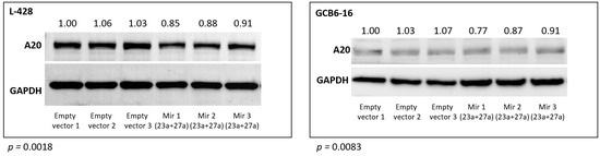 These findings were further confirmed for the A20 (TNFAIP3) protein using Western blot. The abundance of the A20 protein was significantly reduced in the L428 (p = 0.0018) and the GCB6-16 (p = 0.0083) cell lines after transduction with the mir-23a + mir-27a expression construct, as compared to the empty vector transduced cell lines (Figure 3).