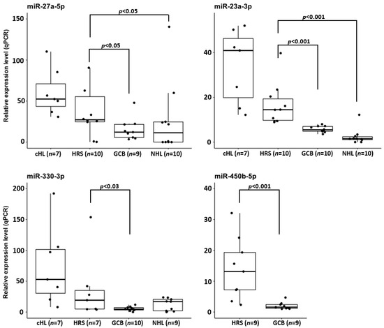 Overexpression of hsa-miR-27a-3p, hsa-miR-23a-3p and hsa-miR-330-3p in cHL cell lines and microdissected HRS cells from cHL cases in comparison to NHL cell lines, and CD77+ GCB cell pools and hsa-miR-450b-5p overexpression in microdissected HRS cells in comparison to CD77+ GCB cell pools.