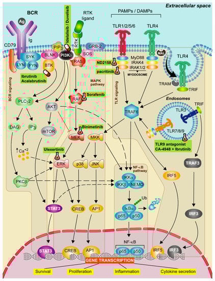 Mitogen-activated protein kinases (MAPKs) are a group of proteins that participate in the regulation of proliferation, differentiation, migration and survival of cells. The canonical activation of this pathway starts when a ligand (e.g., a cytokine, hormone or growth/differentiation factor) binds to the extracellular portion of a receptor tyrosine kinase (RTK), with the consequent phosphorylation and the activation of retrovirus-associated DNA sequences (RAS) proteins. Then, RAS activates a member of the serine-threonine kinase RAF family (BRAF), that facilitates the phosphorylation of the mitogen-activated ERK kinase (MEK) and MEK activates extracellular signal-regulated kinase (ERK), the most important kinase in the cascade that activates different transcription factors []. The MAPK pathway is also activated upon BCR ligation, being the magnitude of MAPK signaling activation a direct readout of BCR signaling []. BCR is also able to regulate phospholipase C gamma, which causes calcium mobilization; and the PI3K activation [] (Figure 1).