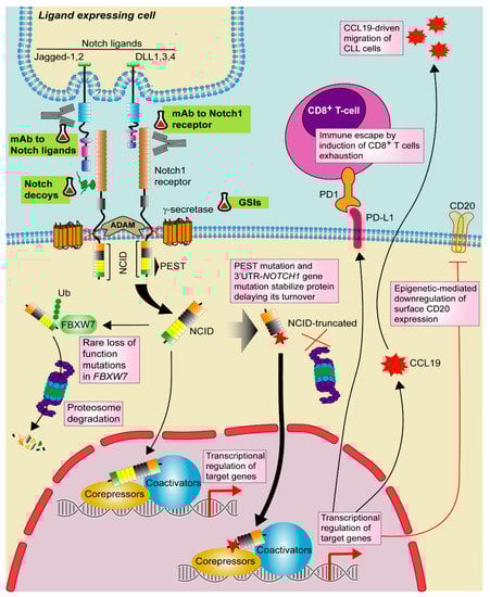 Furthermore, Notch1 signaling promotes an immune escape mechanism in mutated CLL cells through the transcriptional regulation of HLA class-II genes and PD-L1. In particular, Notch1 up-regulates PD-L1 and impairs T-cell activation (Figure 2) []. A recent work showed that constitutive activation of Akt is common in NOTCH1-mutated CLL cells, suggesting a possible biomarker for RT []. Akt initiates CLL transformation via induction of Notch1 signaling between CLL cells and microenvironmental DLL1-expressing T cells.