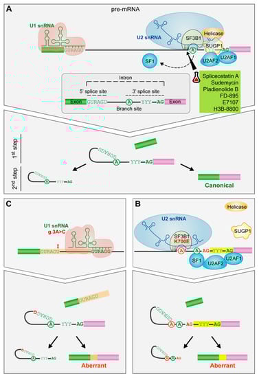 The impact of spliceosome mutations in the spliceosome assembly. (A) Spliceosome assembly of U1 and U2 snRNPs. The spliceosome removes the internal sequences (introns) of the pre-mRNA and splices together the remaining fragments (exons) after the recognition of conserved sequences found at the 5′ and 3′ end of the intron and the branch site (an adenosine residue). U1 snRNP recognizes the 5′splice site by base pairing interactions. Then, SF1, U2AF2 and U2AF1 recognize the branch site, the polypyrimidine tract and the AG dinucleotide of the 3′ splice site, respectively. Afterwards, SF3B1 helps in the recognition of the branch site by U2 snRNA. Finally, the subsequent recruitment of other snRNPs will drive to the splicing of the intron. (B) SF3B1 mutations. SF3B1 mutations disrupt interactions with SUGP1 spliceosomal protein and contribute to an upstream alternative 3′ splice site usage through the use of an alternative branch site. (C) U1 snRNA mutation. The A > C change in the third position favors the C-G base pairing between the third position of the U1 snRNA and the 5′splice site leading to the formation of aberrant 5′ splice sites. Targeted drugs are highlighted in green. Erlenmeyer icon: preclinical studies or clinical trials. R: purine, Y: pyrimidine.