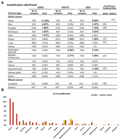 Depending on the cancer type, alterations in the PRC2 methyltransferase complex have been demonstrated to be both pro- and anti-oncogenic [36]. Candidate cancers that might be sensitive to PRC2 inhibitors are those in which PRC2 plays an oncogenic function. These are the tumors characterized by overexpression of PRC2 encoding genes or by GOF mutations in the EZH2 gene leading to an increased PRC2 catalytic activity [2,19,20]. Amplification of the EZH2 coding region has been detected in different tumors [37,38,39,40]. Similarly, the SUZ12 gene is amplified in several tumors [41], nevertheless, there is a lack of information regarding the SUZ12 and EED amplification. Furthermore, amplification frequencies of individual PRC2 components have not been described.