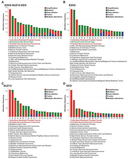PRC2 genes are most frequently altered in subtypes of prostate and lymphoid cancers. (A) Alterations of any PRC2 core genes. The frequencies of alterations (gene amplifications, mutations, deep deletions, fusions or multiple alterations) of PRC2 genes in clinical samples of different cancer types were analyzed using cBioPortal. Red—CRPC and prostate neuroendocrine carcinoma; Green - GCB-DLBCL lymphoma. (B–D) Data for EZH2, SUZ12 and EED, respectively. Please note that for some cases, the gene values for PRC2 subunits individually are lower due to co-occurrence of two or three cases of impairments (demonstrated in Supplementary File S2).