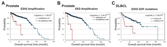 Next, we queried the cBioPortal database to identify the prognostic role of PRC2 impairment in prostate cancer and in DLBCL lymphoma. Figure 3A,B show that amplifications of both EZH2 (logrank p = 1.8 × 10−7 ) and EED (logrank p = 1.4 × 10−10) in prostate cancer were associated with poor prognosis (data from [33,42,43]). For the SUZ12 gene, only two samples with amplifications and survival data are available, making the results uninterpretable.