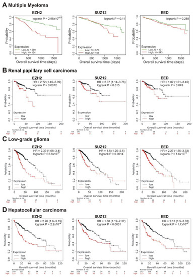 To analyze the correlations of EZH2, SUZ12 and EED expression with the survival of patients with other tumors, we used RNAseq data in the Pan-Cancer dataset of the Kaplan-Maier plotter website (www.kmplot.com, accessed on 15 January 2021). The results are summarized in Table 1.