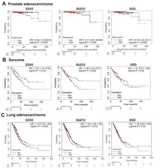 Correlation between the overall survival and the levels of EZH2, SUZ12 or EED gene expression. (A) Prostate adenocarcinoma, (B) sarcoma, and (C) lung adenocarcinoma. The analysis was performed using KMplot resource.
