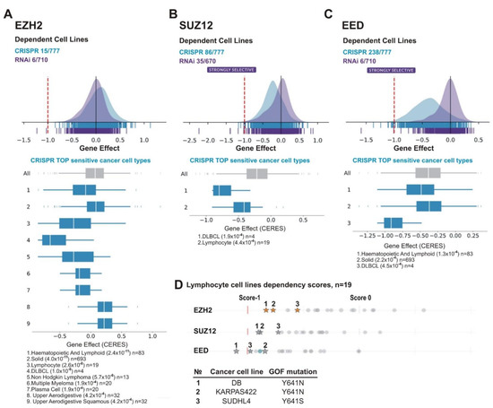 Lymphoid cancer cell lines are particularly sensitive to PRC2 knockout. The analysis was performed using DepMap database. (A) EZH2, (B) SUZ12 and (C) EED. (A–C) UP: schematic representation of the effects of gene knockout (by CRISPR, blue) or knockdown (by RNAi, purple) on cells growth and viability. X-axis: dependency scores (Gene Effect) reflect the dependence of cell growth and survival upon depletion of a particular gene. Negative values indicate that cell proliferation is decreasing upon the gene depletion and score less than −0.5 indicates that the gene is required for survival of a given cancer cell line. Numbers next to “CRISPR” and “RNAi” indicate the amount of sensitive cell lines with score <−0.5/total number of cell lines in each case. DOWN: The TOP sensitive cancer cell types to knockout of EZH2 (A), SUZ12 (B), and EED (C) by CRISPR are shown. (D) Lymphoma lines carrying EZH2 GOF mutations are in TOP of cell lines sensitive to EZH2, SUZ12 or EED knockout. UP: The dependency scores for a panel of lymphoma lines upon knockout of PRC2 genes by CRISPR. Asterisks indicate the cell lines with GOF mutations in the EZH2 SET domain, grey circles—lines without GOF mutations. DOWN: The GOF mutations in test cell lines are indicated.