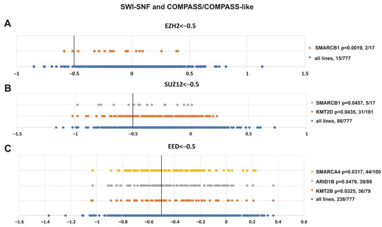 Mutations in genes encoding subunits of the SWI/SNF and COMPASS-like complexes correlate with sensitivity to PRC2 knockout. (A) EZH2, (B) SUZ12 and (C) EED. The X-axis shows the dependency scores of the lines with alterations of a particular gene (orange, grey and yellow circles) vs. all cell lines (blue circles, 777 in total). Black bold vertical line indicates the dependency score −0.5 (the score <−0.5 mean that gene is critical for cells survival). p-value—the statistical significancy for hypothesis that the cell lines with SWI/SNF or COMPASS mutations will have a score of less than −0.5. The number of cancer cell lines bearing an altered gene with a score <−0.5/total number of cell lines bearing the altered gene is indicated at the right.