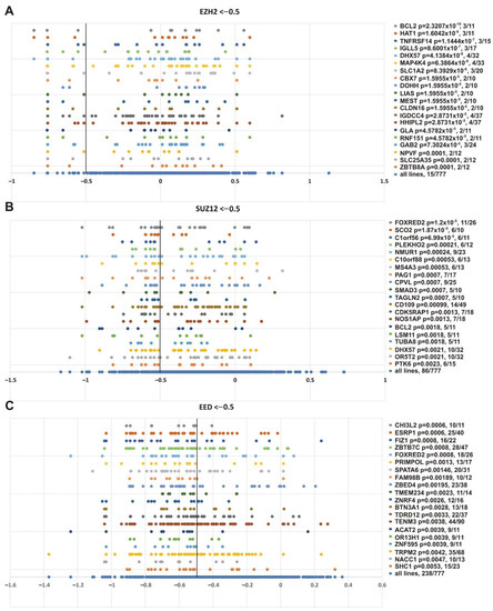 With this information, we aimed to identify more gene candidates as markers for sensitivity to PRC2 inhibition. In so doing, we generated a Python application to challenge a hypothesis of dependence between the growth inhibition upon knockout of EZH2, SUZ12, or EED, and the presence of each documented mutation (https://github.com/genesolution/PRC2_data, uploaded on 25 March 2021). For the test hypothesis, a cell line was considered to be “sensitive” if it had a score <−0.5 (inhibition of the majority of cells). This value was provided to us as the universal effect limit for the DepMap tables due to the normalization that had been previously done by the DepMap table authors. In our analysis, we used all types of genetic alterations, except synonymous mutations marked as “silent” (using Variant_Classification column).
