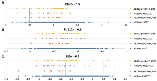 Finally, we were interested in finding genes whose impairment was correlated with inhibition of the three PRC2 subunits. Figure 10 shows that alterations in SUSD2 (sushi domain containing 2), FIZ1 (FLT3 interacting zinc finger 1) and FBXW11 (F-box and WD repeat domain containing 11) genes correlated with knockout of EZH2 (p = 0.0319, p = 0.0097, p = 0.0519, respectively), SUZ12 (p = 0.0027, p = 0.0092, p = 0.0131, respectively) and EED (p = 0.0472, p = 0.0008, p = 0.0081, respectively). Intriguingly, FBXW11 co-purifies with EED [103], SUZ12 and EZH2 [104].
